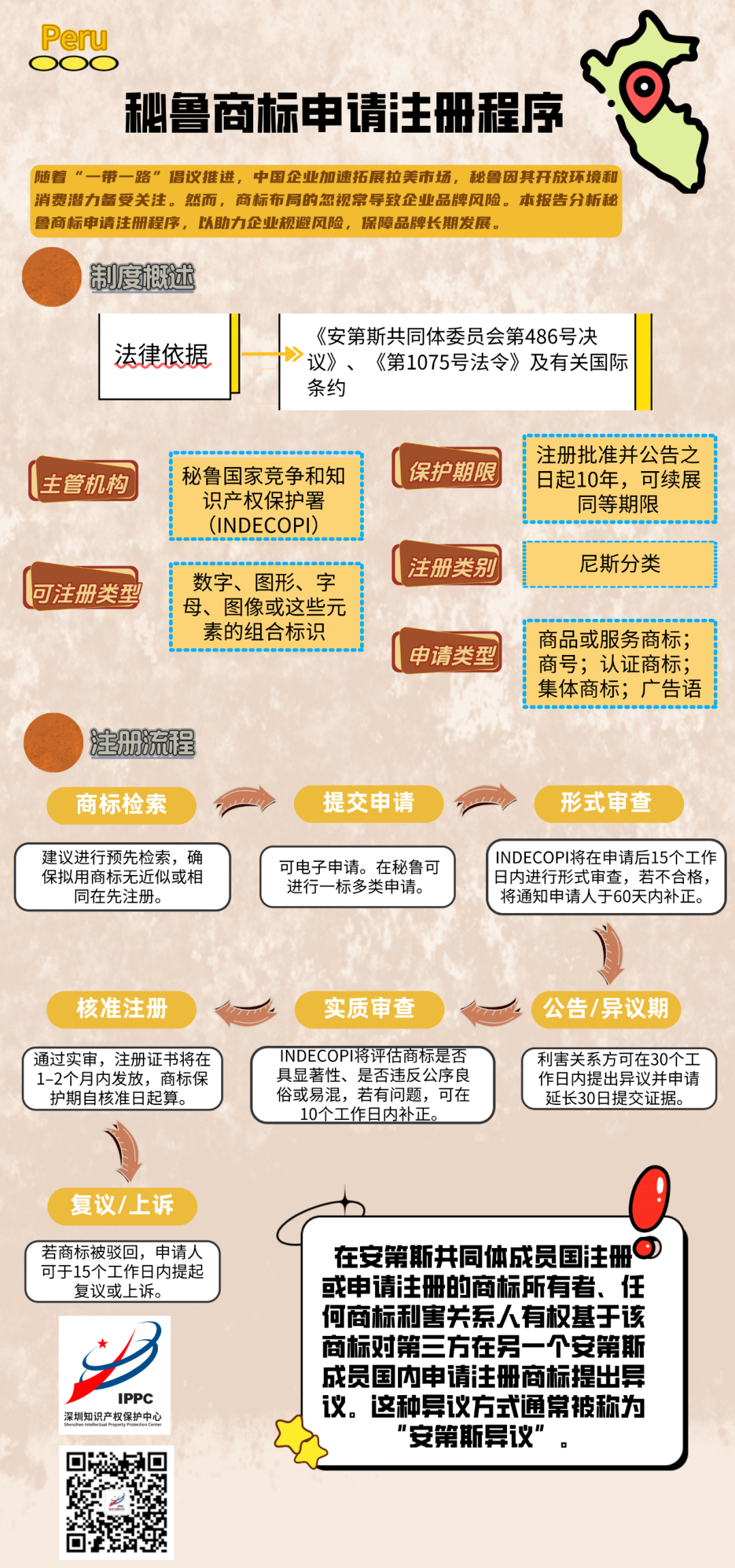 近年来,随着中国共建“一带一路”倡议的深入落实,企业拓展海外市场的步伐不断加快,拉美地区逐渐成为一个极具增长潜力的广阔市场。秘鲁作为拉美新兴经济体,其开放的市场环境与不断增长的消费需求吸引众多中国企业进入。然而,许多企业在开拓秘鲁市场过程中忽视了商标布局的前置性和战略性,导致品牌权益受损、法律风险增加。本报告对秘鲁商标注册制度进行系统分析,帮助企业提前规避潜在风险、助力品牌在当地的合法性与持续性运营。 一、秘鲁商标注册概述 01 适用法律 秘鲁现行商标法规主要为 2000年12月1日生效的《安第斯共同体委员会第486号决议》及2009年2月1日生效的《第1075号法令》。同时,秘鲁作为《巴黎公约》、《WIPO公约》等成员国,同样遵守此类国际公约关于商标保护的各项标准,但因其暂未加入《马德里协定》或《马德里议定书》,故商标只能“单国注册”。 02 主管机构 秘鲁国家竞争和知识产权保护署(以下简称INDECOPI)负责统一管理商标事务,若想在秘鲁注册商标,申请人必须向INDECOPI提交有关材料,并遵守INDECOPI官方规定程序。 03 商标可注册的类型 04 保护期限及续展规定 秘鲁商标注册有效期为10年,从注册批准并公告之日起算。有效期届满前6个月可通过办理续展手续维持商标继续有效。续展商标需要提交商标申请表、委托书(如续展由第三方完成)等,续展申请费以及所需提交的相关材料以官方要求为准[1]。如满足续展要求,INDECOPI通常会在15个工作日内发出续展决议,秘鲁商标续展期限为10年。 二、秘鲁商标注册流程 秘鲁采用“申请在先”原则作为其商标注册制度的核心原则,商标权的取得主要通过注册实现,而不是使用。这意味着,即使某一商标已在秘鲁市场使用,但若未及时提交注册申请,仍可能因他人抢先注册而丧失商标权。因此,企业若计划进入秘鲁市场,应尽早提交商标注册申请,以确保品牌权益得到法律保护。 01 前期准备 1. 商标检索 正式进入秘鲁商标注册申请程序之前,建议进行检索以确保拟用商标不与先前注册的商标类似或相同。INDECOPI官方提供了检索工具[2]以辅助申请者进行排查。 2. 注册类别选择 秘鲁商标注册采用《商品和服务国际分类》(以下简称尼斯分类)体系,所有商标均按类别注册。目前,根据尼斯分类,商标共分为 45 个类别:商品 34 个,服务 11 个。如果想注册商标,必须确定销售或提供的产品或服务的类别。申请者可以使用INDECOPI官方免费的搜索引擎[3],快速识别判定产品或服务所属的类别。 3.申请所需材料 申请者需提供以下基本材料[4]: (1)申请表[5]两份,由申请者填写并签名; (2)身份证复印件。若是代表他人申请注册商标,需提供一份简易的委托书。若代表法人实体,需提交法人注册登记表和登记表的复印件; (3)拟申请商标复印件; (4)若希望申请图形标志,则须提交两份图像或照片的复印件,最好为黑白,尺寸为 5x5 厘米; (5)若希望保护颜色,则必须提交带有该颜色的图片; (6)如申请人希望援引《巴黎公约》第六条之五[6]规定的权利,还须提供原属国授权机构颁发的注册证书[7]; (7)若声明优先权的,需提供优先权证明文件及对应翻译件。 02 提交申请 申请者可以通过电子方式提交申请。在秘鲁可进行一标多类申请。根据INDECOPI的规定,一个类别商标申请费用为534.99秘鲁索尔[8],如希望在多个类别中注册商标,则须为每个附加类别支付533.30秘鲁索尔。此外,如果选择通过代理机构或律师提交申请,可能会产生额外的服务费用,中国企业申请必须委托当地的律师和代理结构协助提交。 03 形式审查 自申请日起15个工作日内,INDECOPI需进行形式审查,以确定提交的申请是否符合基本的形式要求。例如材料是否填写完整、是否缴纳费用、商标图样是否清晰、是否明确指定出商品或服务类别等。如果形式审查不合格,INDECOPI会通知申请人并要求其在通知之日起60天内予以补正。 04 公告期/异议期 形式审查完成后,商标将在INDECOPI的电子官方公报上公布。如想对商标注册申请提出异议,自公布之日起30个工作日内,任何利害关系方可提出一次异议[9],并可申请额外的30个工作日来提交相关证据。INDECOPI随后将通知异议申请人,申请人可在30个工作日内提交答辩状。申请人也可申请额外30个工作日来提交答辩状。 异议主要理由有:与已有商标存在冲突,例如已注册的在先商标或已实际使用但尚未注册的商标;商标不具备足够显著性;商标带有明显的描述性特征;商标可能具 有误导性或欺骗公众的可能;商标与驰名商标相冲突等。 因秘鲁属于安第斯成员国,任何利害关系方针对在秘鲁公告期内的商标还可利用“安第斯异议”规则来提异议,下文部分将讲述该异议方式及优势。 05 实质审查 公告期内无人异议或者异议不成立的,INDECOPI将对商标进行实质审查,审查分析商标是否符合显著性的基本要求以及商标是否违反道德或公共秩序,尤其是是否具有欺骗公众的性质(绝对理由);审查分析商标是否会与先前申请或注册的其他商标产生混淆或联想的可能性(相对理由)。如有问题,INDECOPI会发出驳回通知或初步异议意见,申请人必须在通知后的10个工作日内提交答辩意见或补充材料,否则视为放弃。 06 核准注册 如申请商标顺利通过实质审查,注册证书将于1-2个月内发放。总体来看,INDECOPI的审查周期为自申请日起3至5个月。对商标的保