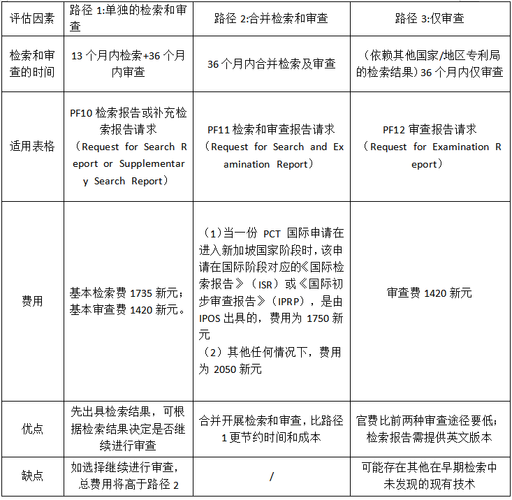 依据 IPOS相关规定,申请人可结合国外检索结果、审查结果的获取情况及成本等因素,综合评估后选择适用的检索与审查路径,具体路径详见下表: