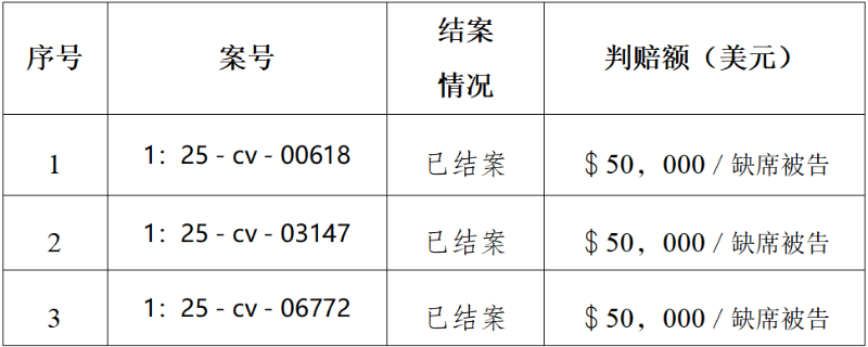 2025年10月1日,法院完成了对被告的缺席登记并作出了缺席判决。永久禁止缺席被告的侵权行为,并判令每个被告赔偿Lululemon 5万美元,授权Lululemon直接从第三方平台冻结的被告账户中划拨资金作为赔偿。原告的初步禁令动议因已无实际意义而被驳回,原因是初步禁令中所载的救济措施已包含在缺席判决中。