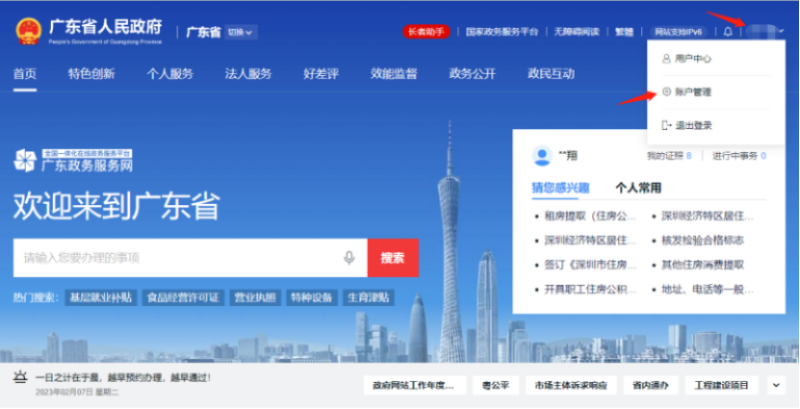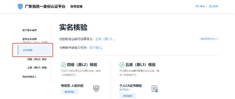 进入广东政务服务网(http://www.gdzwfw.gov.cn),使用账号登录后点击右上角【用户名称】→【账户管理】→【实名核验】中,查看目前可信等级以及了解对应等级进行核验升级的流程 。