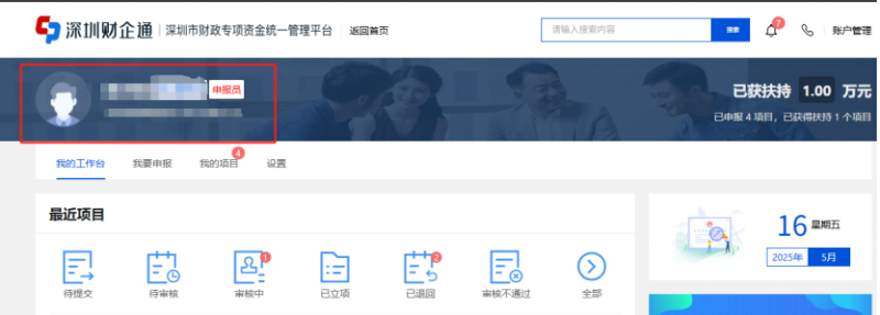 申请人首次登录深圳市财政专项资金统一管理平台(财企通),需点击右上角【我的工作台】-【设置】-【基本信息】完善账号信息,账号信息完善后才能进行下一步操作。